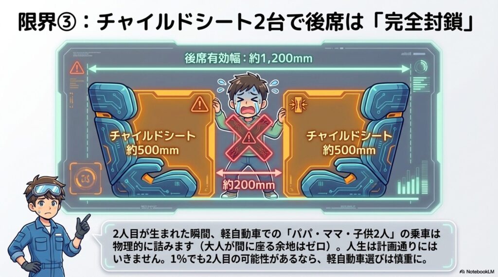軽自動車の後部座席の有効幅は約1,200mm。チャイルドシート1台の幅は約440~500mm。2台並べると900~1,000mm。大人が間に座る余地はほぼゼロです。