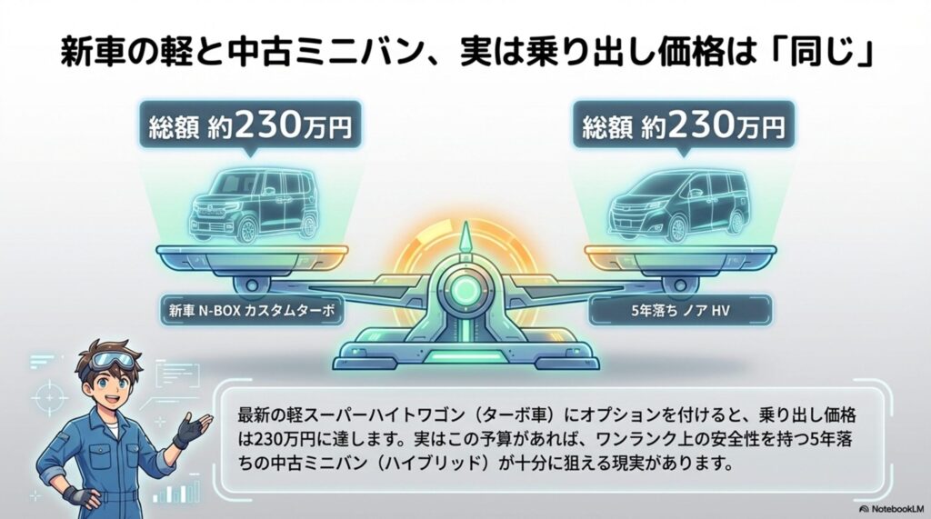 - 新車の軽ターボ(230万円)と中古ミニバンHV(200~230万円)は乗り出し価格がほぼ同じ