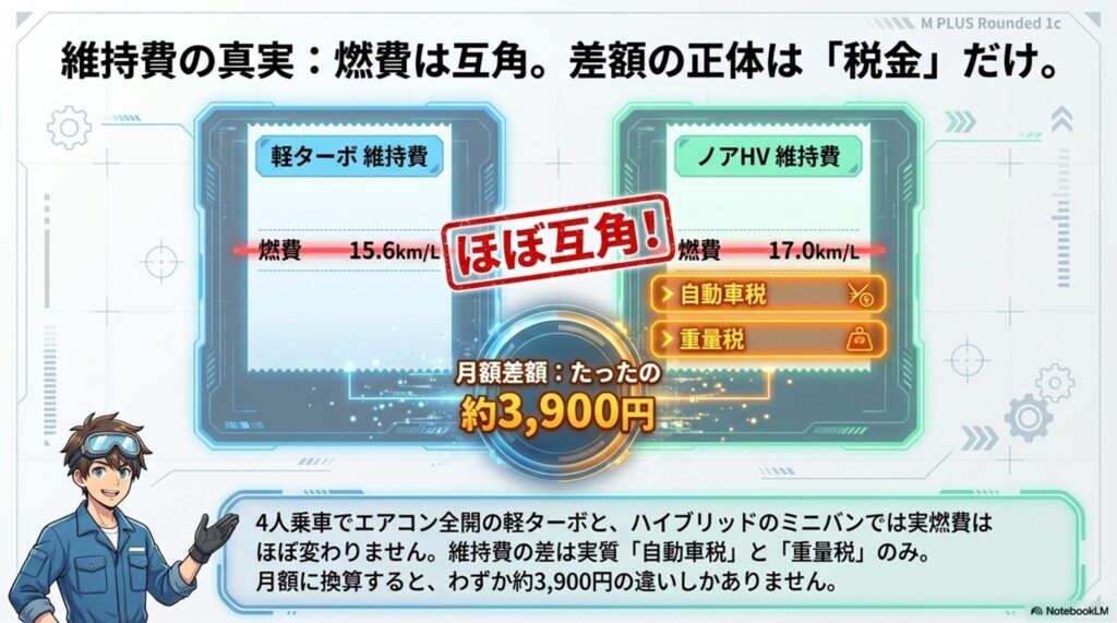 つまり、維持費の差の正体はほぼ「自動車税」と「重量税」だけ。月にすると約3,900円。年間で約4.7万円。