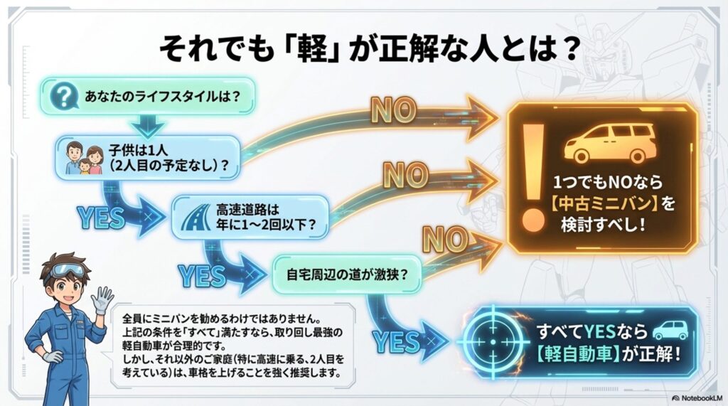 結論:軽が最適解な人は確実にいる。以下の3つの条件を「全部」満たすなら、ミニバンより軽を選ぶ方が合理的。